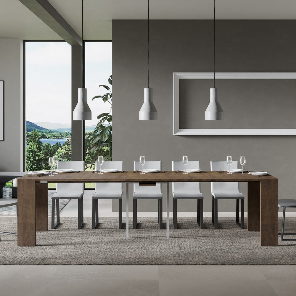 Consolle allungabile Pianiga, versatile e robusta, un complemento perfetto per ogni ambiente della casa: ingresso, cucina, sala da pranzo, soggiorno o corridoio.La consolle allungabile Pianiga può essere facilmente trasformata in un ampio tavolo da pranzo lungo fino a 300 cm, in grado di ospitare 14 persone.Realizzata con pannelli in nobilitato.Il sistema di allunghe con guide telescopiche in alluminio e il sostegno centrale in dotazione rendono la consolle stabile e robusta.Una volta che la consolle è chiusa, le allunghe devono essere riposte altrove.Made in ItalyDimensioni:Consolle chiusa: L.90 P.40 H.77 cmLunghezza con 1 allunga: 92 cmLunghezza con 2 allunghe: 144 cmLunghezza con 3 allunghe: 196 cmLunghezza con 4 allunghe: 248 cmLunghezza con 5 allunghe: 300 cm