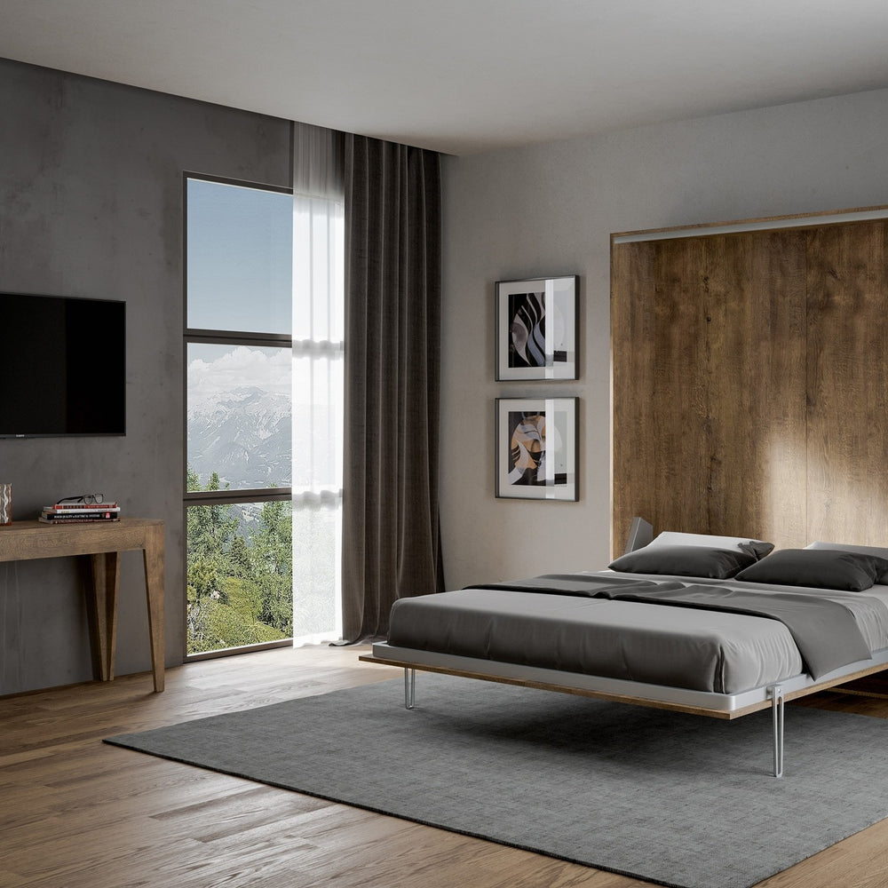 Il letto a scomparsa verticale Erbè matrimoniale 160 rappresenta tutta la comodità che ti serve in uno spazio ridottissimo: solo 39,2 cm a parete; quando è aperto, non occupa più spazio di un letto normale, solo 215 cm. Particolarmente adatto in monolocali o in ambienti dove vi è la necessità di avere spazi utili durante il giorno.Struttura del letto realizzata con pannelli di particelle di legno nobilitato sp.18 mm.Struttura della rete in ferro rinforzato verniciato a polvere epossidica colore alluminio goffrato.Incluso di rete a doghe di faggio cm 163x190 con cinghie ferma materasso.La discesa del letto è assistita da pistoni a gas e agevolata dalla presenza della maniglia.Materasso non compreso. Dimensioni consigliate del materasso: L.160 P.190 H.22 cm. Portata massima letto kg 240.Attenzione:Il letto a scomparsa Erbè arriva smontato. Il montaggio prevede una difficoltà elevata e necessita di due persone esperte per eseguirlo. È obbligatorio il fissaggio a muro.Dimensioni:Letto chiuso: L.173,6 P.39,2 H.210,5 cmLetto aperto: L.173,6 P.215 H.210,5 cmAltezza rete da terra: 22 cmAltezza massima materasso: 24 cmMade in Italy