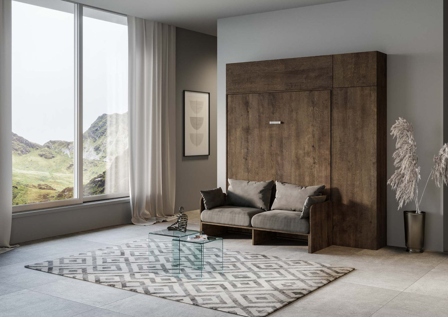 Il letto a scomparsa verticale Erbè Sofà matrimoniale 160 rappresenta un’idea originale che, grazie alla presenza del divano, trasforma la zona giorno in zona notte in poche semplici mosse. Una soluzione perfetta per monolocali e spazi ridotti dove ogni metro quadrato è importante: questo modello smart vi permette di ottimizzare il vostro spazio, senza rinunciare alla comodità, al comfort e al design. I cuscini del divano, completamente sfoderabili, sono realizzati in microfibra. Composizione proposta con una pratica e capiente colonna, posizionabile indifferentemente sia a sinistra che a destra del letto, e con due pensili che permettono di riporre al proprio interno tutto il necessario, per una camera da letto sempre in ordine. Ante colonna e pensili con apertura push-pull. Il pensile sopra colonna è provvisto di apertura a battente dx o sx mentre il pensile orizzontale è con apertura a vasistas.Struttura della composizione realizzata con pannelli di particelle di legno nobilitato sp.18 mm.Struttura della rete in ferro rinforzato verniciato a polvere epossidica colore alluminio goffrato.Incluso di rete a doghe di faggio cm 163x190 con cinghie ferma materasso.La discesa del letto è assistita da pistoni a gas e agevolata dalla presenza della maniglia.Materasso non compreso. Dimensioni consigliate del materasso: L.160 P.190 H.22 cm. Portata massima letto kg 240.Attenzione:Il letto a scomparsa Erbè Sofà arriva smontato. Il montaggio prevede una difficoltà elevata e necessita di due persone esperte per eseguirlo. È obbligatorio il fissaggio a muro.Dimensioni:Composizione con letto chiuso: L.233,6 P.105,2 H.250,5 cmComposizione con letto aperto: L.233,6 P.215 H.250,5 cmColonna: L.60 P.39,2 H.210,5 cmPensile sopra colonna: L.60 P.39,2 H.40 cmPensile orizzontale: L.173,6 P.39,2 H.40 cmAltezza rete da terra: 22 cmAltezza massima materasso: 24 cmMade in Italy