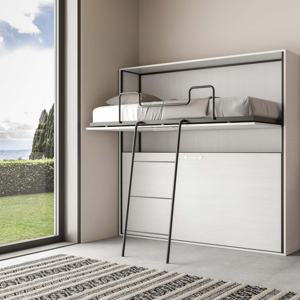 Letto a scomparsa orizzontale Ferrara versione con due letti singoli a castello. Una soluzione salvaspazio pratica e originale che consente di sfruttare al meglio ogni singolo centimetro di superficie, permettendo la possibilità di trasformare in poche mosse e semplici mosse una zona giorno in zona notte. Ideale anche per chi ha a disposizione spazi ridotti. Quando chiuso occupa relativamente poco spazio, quando aperto offre lo stesso comfort e lo stesso riposo di un normale letto singolo. Struttura del letto realizzata con pannelli di particelle di legno nobilitato sp.18 mm.Struttura della rete in ferro rinforzato verniciato a polvere epossidica colore alluminio goffrato.Il meccanismo di apertura è provvisto di un sistema anti-chiusura con bloccaggio di sicurezza con maniglie di sgancio laterali.Incluso di rete ortopediche realizzate in doghe di legno lamellare da 85x190 cm con cinghie ferma materasso.Materassi non compresi. Dimensioni consigliate dei materassi: cm 85×185 H.max 14.Il letto rimane stabile grazie ad un meccanismo di sicurezza interno che ne assicura la rigidità.Il letto può essere aperto a propria necessità, solo il letto superiore, solo il letto inferiore o entrambi contemporaneamente.Il letto inferiore è dotato di piedini estraibili che consentono alla rete inferiore di poggiare a terra in tutta sicurezza, mentre il letto superiore è dotato di pratiche scalette per scendere o salire. La discesa dei letti è agevolata dalle maniglie incluseNota importante sul montaggio:Il letto a scomparsa Ferrara arriva smontato. Il montaggio prevede una difficoltà elevata e necessita di due persone esperte per eseguirlo. È obbligatorio il fissaggio a muro.Dimensioni:Letto chiuso a parete: L.199,9 P.39,2 H.190,8 cmLetto aperto: L.199,9 P.106 H.190,8 cmAltezza da terra della rete inferiore: 33 cmAltezza da terra della rete superiore: 127 cmMade in Italy.