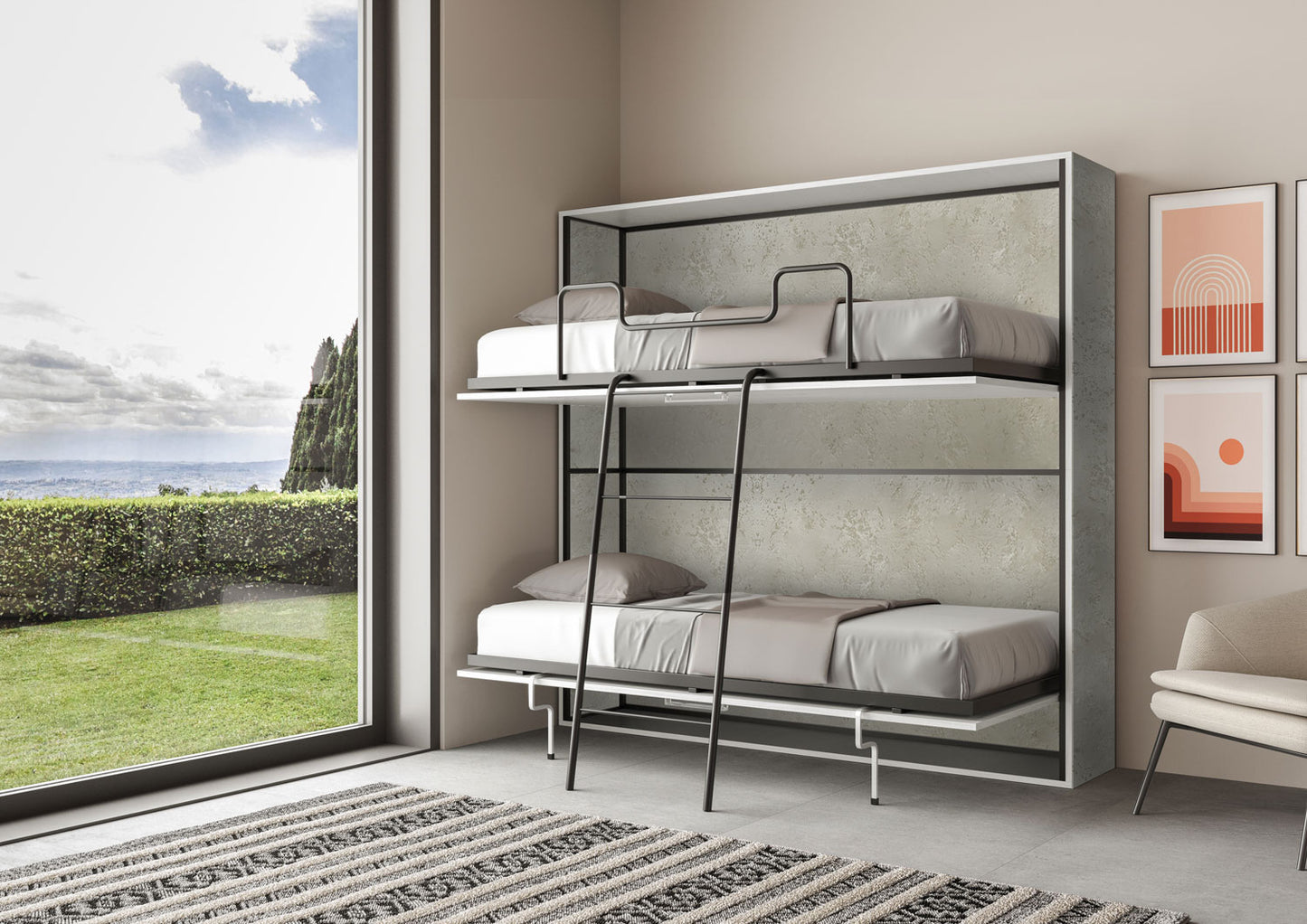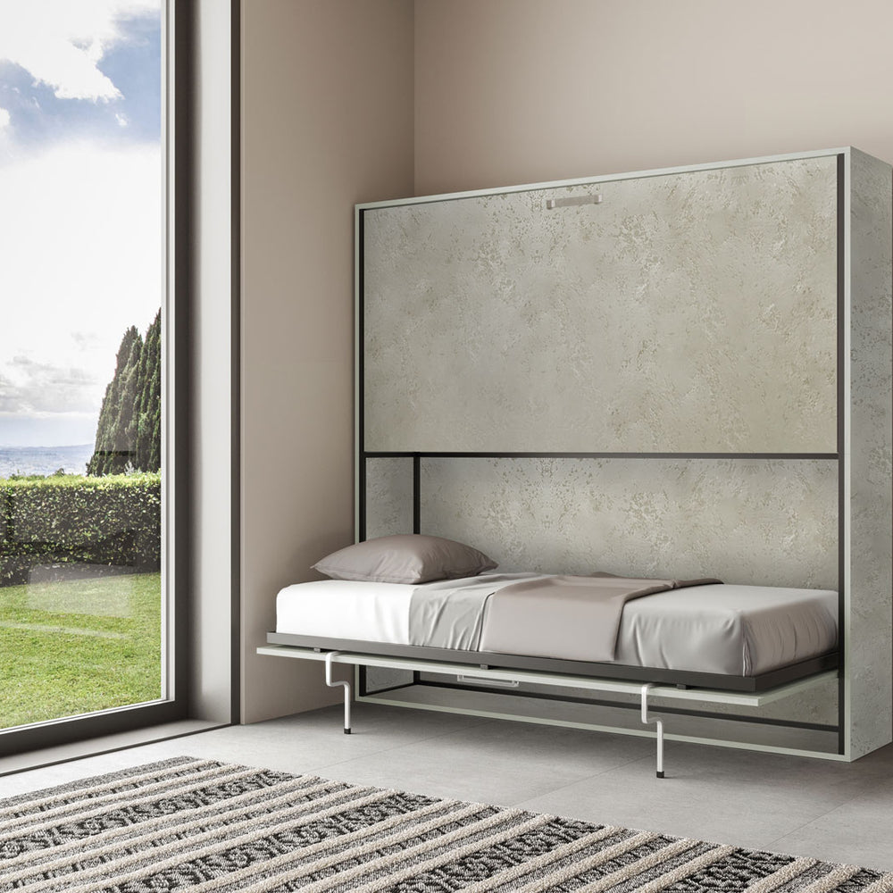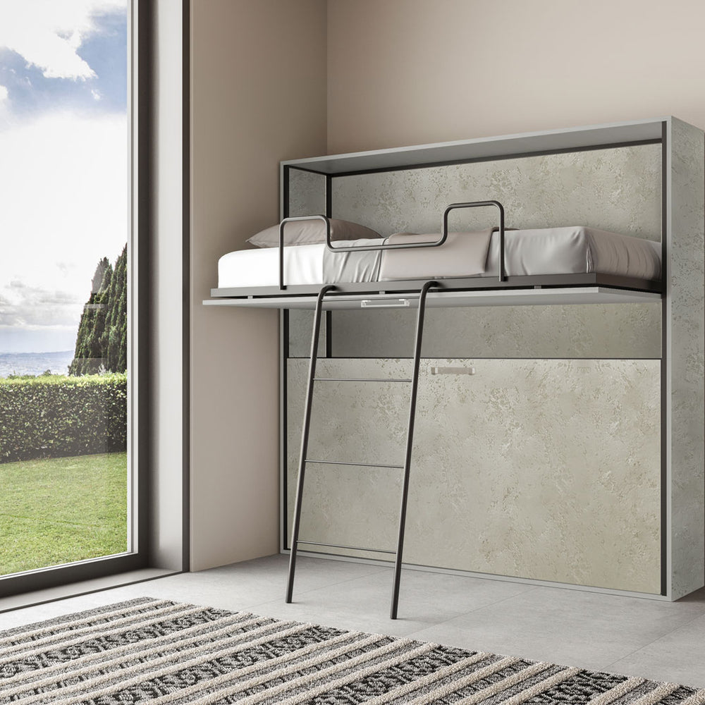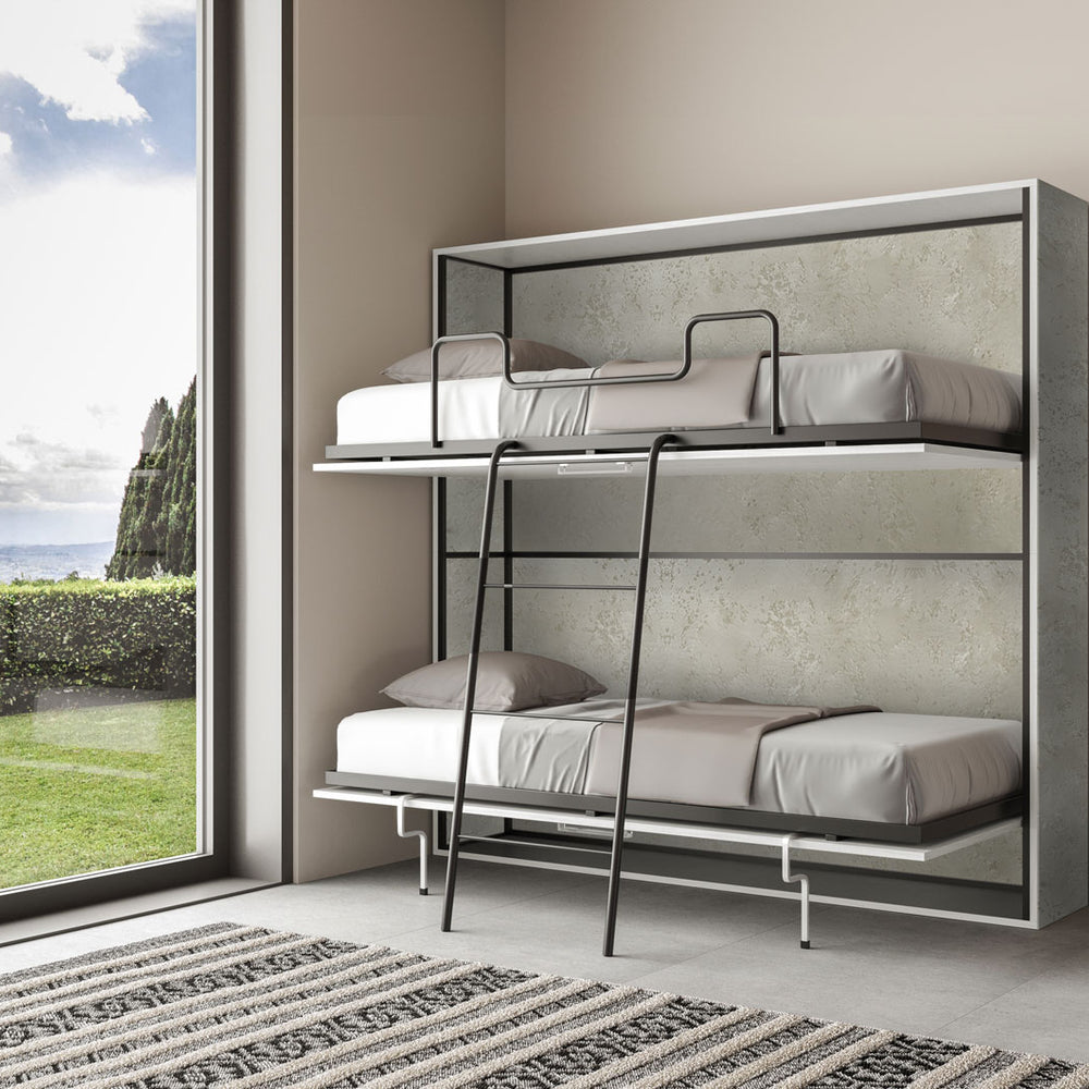 Letto a scomparsa orizzontale Ferrara versione con due letti singoli a castello. Una soluzione salvaspazio pratica e originale che consente di sfruttare al meglio ogni singolo centimetro di superficie, permettendo la possibilità di trasformare in poche mosse e semplici mosse una zona giorno in zona notte. Ideale anche per chi ha a disposizione spazi ridotti. Quando chiuso occupa relativamente poco spazio, quando aperto offre lo stesso comfort e lo stesso riposo di un normale letto singolo. Struttura del letto realizzata con pannelli di particelle di legno nobilitato sp.18 mm.Struttura della rete in ferro rinforzato verniciato a polvere epossidica colore alluminio goffrato.Il meccanismo di apertura è provvisto di un sistema anti-chiusura con bloccaggio di sicurezza con maniglie di sgancio laterali.Incluso di rete ortopediche realizzate in doghe di legno lamellare da 85x190 cm con cinghie ferma materasso.Materassi non compresi. Dimensioni consigliate dei materassi: cm 85×185 H.max 14.Il letto rimane stabile grazie ad un meccanismo di sicurezza interno che ne assicura la rigidità.Il letto può essere aperto a propria necessità, solo il letto superiore, solo il letto inferiore o entrambi contemporaneamente.Il letto inferiore è dotato di piedini estraibili che consentono alla rete inferiore di poggiare a terra in tutta sicurezza, mentre il letto superiore è dotato di pratiche scalette per scendere o salire. La discesa dei letti è agevolata dalle maniglie incluseNota importante sul montaggio:Il letto a scomparsa Ferrara arriva smontato. Il montaggio prevede una difficoltà elevata e necessita di due persone esperte per eseguirlo. È obbligatorio il fissaggio a muro.Dimensioni:Letto chiuso a parete: L.199,9 P.39,2 H.190,8 cmLetto aperto: L.199,9 P.106 H.190,8 cmAltezza da terra della rete inferiore: 33 cmAltezza da terra della rete superiore: 127 cmMade in Italy.Prodotto