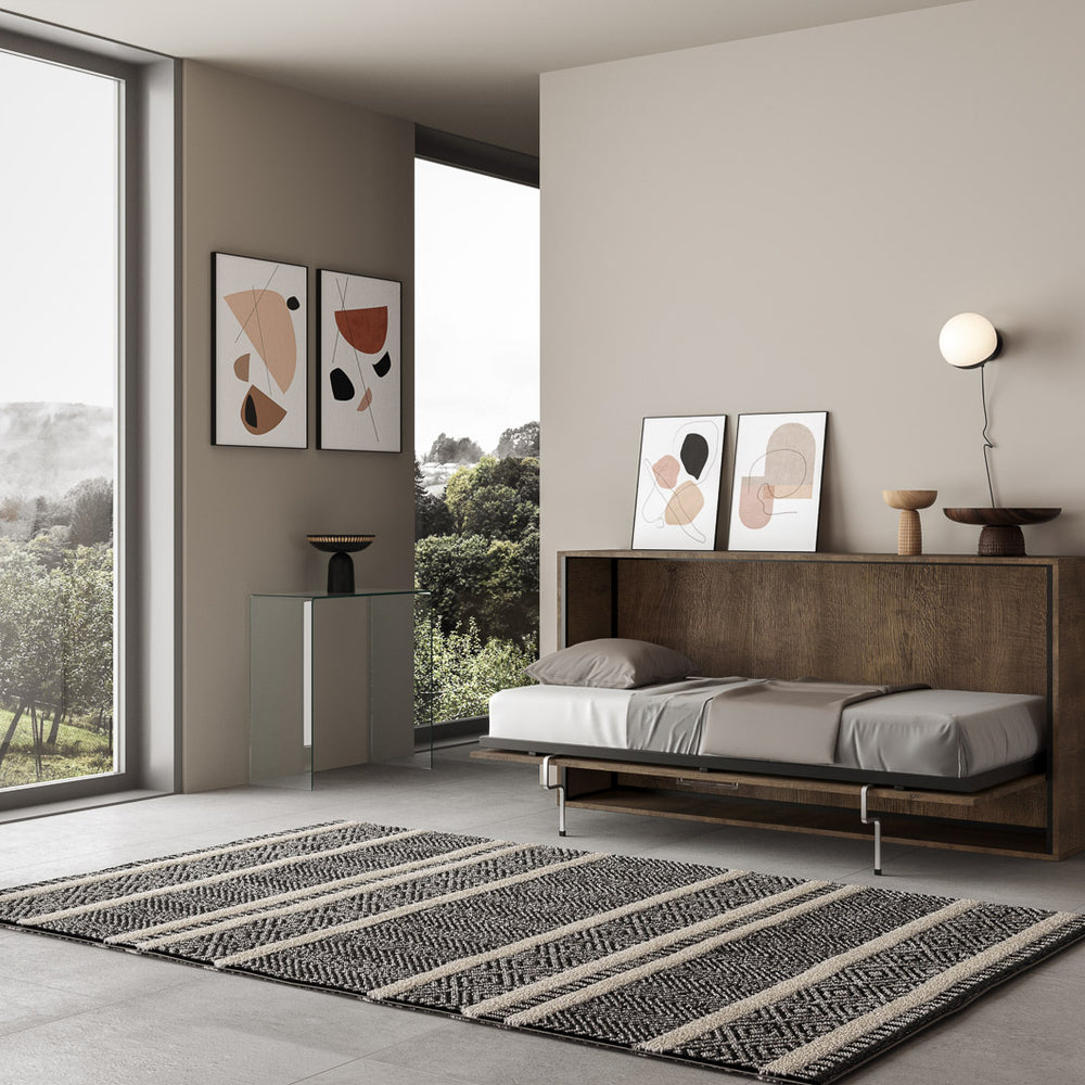 Letto a scomparsa orizzontale Ferrara versione singola. Una soluzione salvaspazio pratica e originale che consente di sfruttare al meglio ogni singolo centimetro di superficie, permettendo la possibilità di trasformare in poche mosse e semplici mosse una zona giorno in zona notte. Ideale anche per chi ha a disposizione spazi ridotti. Quando chiuso occupa relativamente poco spazio, quando aperto offre lo stesso comfort e lo stesso riposo di un normale letto singolo. Struttura del letto realizzata con pannelli di particelle di legno nobilitato sp.18 mm.Struttura della rete in ferro rinforzato verniciato a polvere epossidica colore alluminio goffrato.Il meccanismo di apertura è provvisto di un sistema anti-chiusura con bloccaggio di sicurezza con maniglie di sgancio laterali.Incluso di rete ortopedica realizzata in doghe di legno lamellare da 85x190 cm con cinghie ferma materasso.Materasso da cm 85x185 H.14 incluso.Il letto rimane stabile grazie ad un meccanismo di sicurezza interno che ne assicura la rigidità.In fase di apertura, il piedino dovrà essere estratto manualmente per consentire l'appoggio a terra della rete. La discesa del letto è agevolata dalla maniglia inclusa.Nota importante sul montaggio:Il letto a scomparsa Ferrara arriva smontato. Il montaggio prevede una difficoltà elevata e necessita di due persone esperte per eseguirlo. È obbligatorio il fissaggio a muro.Dimensioni:Letto chiuso a parete: L.199,9 P.39,2 H.97,4 cmLetto aperto: L.199,9 P.106 H.97,4 cmAltezza da terra materasso: 47 cmMade in Italy.