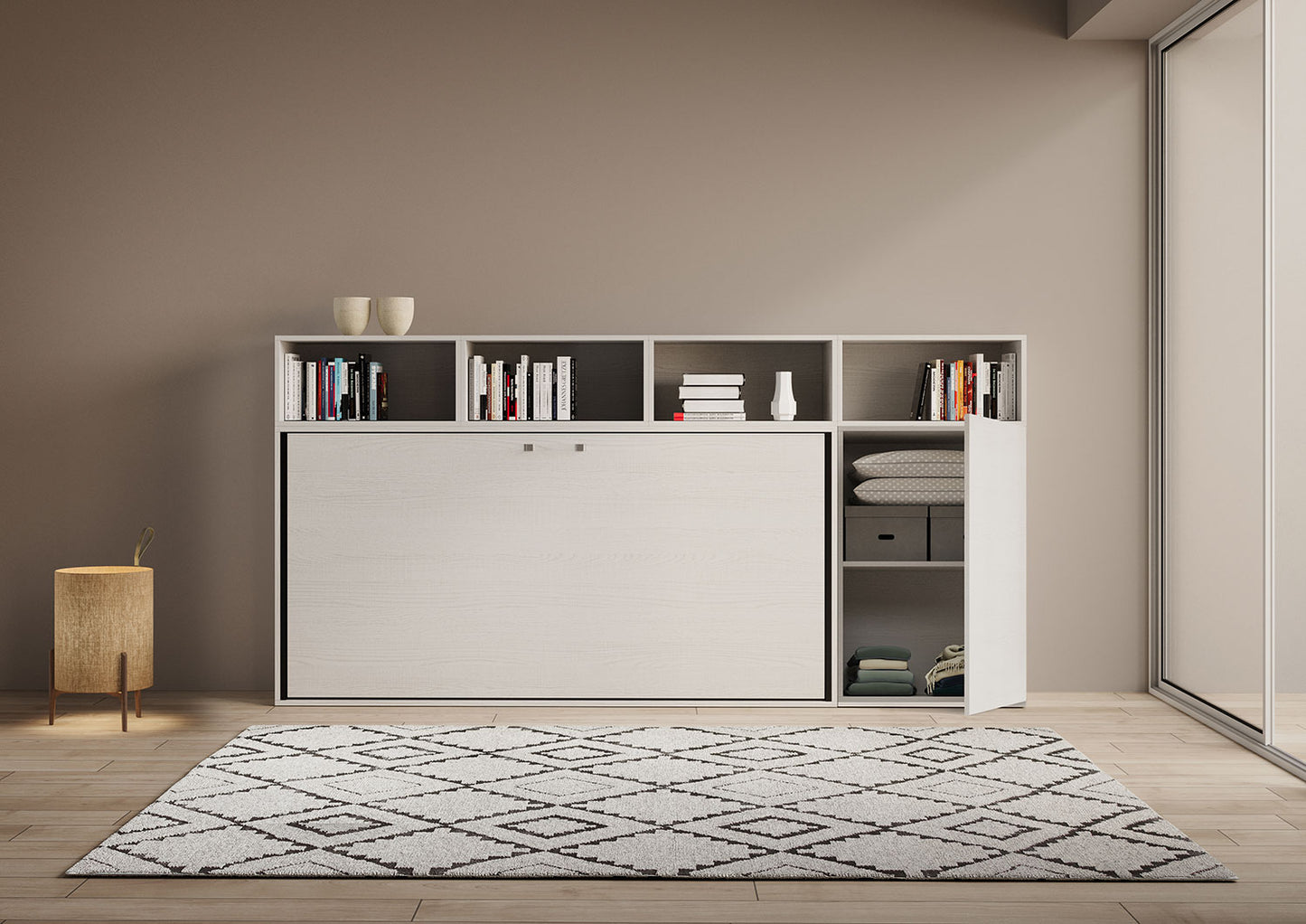 Ferrara A è un letto singolo a scomparsa che si integra con una composizione di mobili (un vano con anta e ripiano interno e quattro vani aperti). Si tratta di una soluzione originale e funzionale, che consente di ottimizzare lo spazio disponibile, occupando solo 39,2 cm di profondità quando è chiuso. Quando è aperto, offre il comfort e il relax di un letto da una piazza.Struttura realizzata con pannelli di particelle di legno nobilitato sp.18 mm.Struttura della rete in ferro rinforzato verniciato a polvere epossidica colore alluminio goffrato.Il meccanismo di apertura è provvisto di un sistema anti-chiusura con bloccaggio di sicurezza con maniglie di sgancio laterali.Incluso di rete ortopedica realizzata in doghe di legno lamellare da 85x190 cm con cinghie ferma materasso.Materasso da cm 85x185 H.14 incluso.Il letto rimane stabile grazie ad un meccanismo di sicurezza interno che ne assicura la rigidità.In fase di apertura, il piedino dovrà essere estratto manualmente per consentire l'appoggio a terra della rete. La discesa del letto è agevolata dalla maniglia inclusa.Nota importante sul montaggio:Il letto a scomparsa Ferrara arriva smontato. Il montaggio prevede una difficoltà elevata e necessita di due persone esperte per eseguirlo. È obbligatorio il fissaggio a muro.Dimensioni composizione:Letto chiuso a parete: L.266,5 P.39,2 H.129,7 cmLetto aperto: L.266,5 P.106 H.129,7 cmAltezza da terra materasso: 47 cmMade in Italy.
