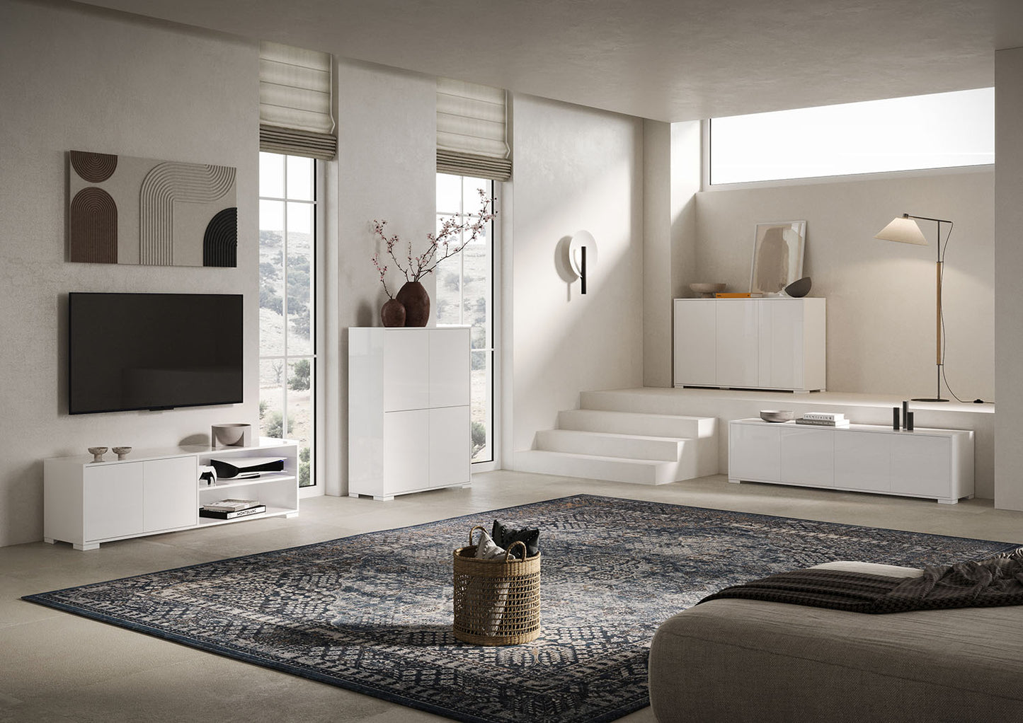 Porta TV 2 ante con vano a giorno 150x40x40 cm Ladinia bianco lucido