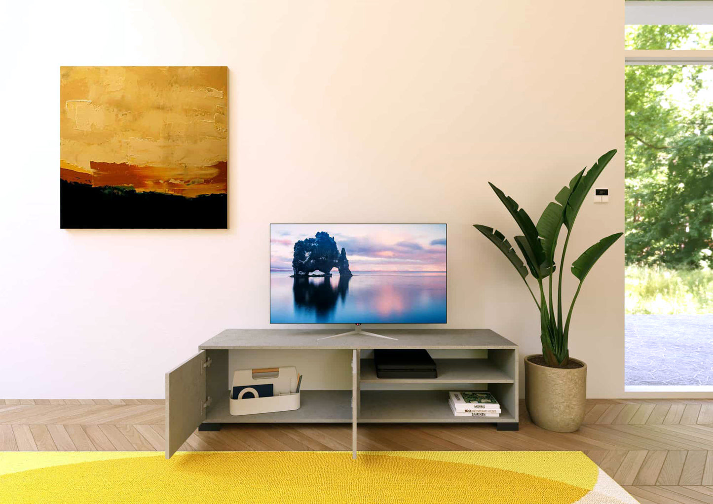 Il mobile porta TV Ladinia è un complemento d’arredo moderno, robusto ed elegante, che aggiunge un tocco di raffinatezza al soggiorno. Si integra perfettamente con le madie moderne della stessa collezione, creando un ambiente armonioso e sofisticato. Il mobile porta TV Ladinia è dotato di due ante e di due vani a giorno, perfetti per posizionare decoder, consolle e altri dispositivi elettronici. Il mobile porta TV viene fornito smontato. Prodotto Itamoby Made in Italy Caratteristiche: • Realizzato con pannelli ecologici di particelle di legno sp.15 mm • Ante con apertura push-pull • Piedini in resina H.4 cm • Certificazione FSC Dimensioni: • L.150 H.40 P.40 cm • Utile vano ante battenti: L.73 H.33 cm • Utile vano a giorno inferiore: L.73 H.16,5 cm • Utile vano a giorno superiore: L.73 H.15 cm