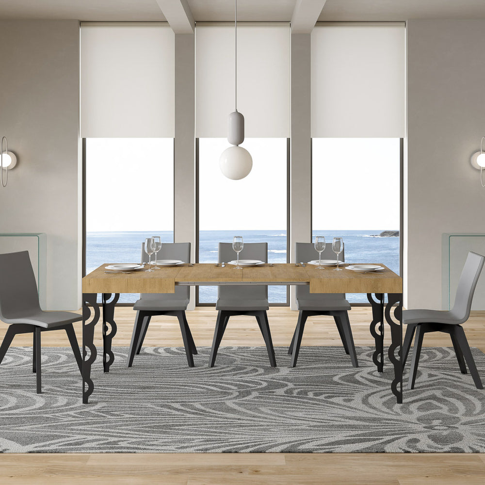Tavolo allungabile Noale da 120 cm, dal design moderno dallo stile ricercato e stravagante, si adatta a qualsiasi stile di arredamento e si rivela la scelta ideale sia come tavolo da pranzo che come elemento d'arredo per il soggiorno, dove poter accogliere i propri ospiti con stile.Il tavolo allungabile Noale è in grado di estendersi progressivamente fino a 204 cm capace di ospitare 10 persone.Realizzato con pannelli in nobilitato, gambe in ferro, piano con lavorazione a Folding.Il sistema di estensione con guide telescopiche in alluminio e il sostegno centrale in dotazione rendono il tavolo stabile e robusto anche se totalmente allungato.Le allunghe sono immediatamente pronte all'utilizzo in quanto alloggiate sotto il piano principale.Made in ItalyDimensioni:Tavolo chiuso: L.120 P.80 H.77 cmLunghezza con 1 allunga: 162 cmLunghezza con 2 allunghe: 204 cm