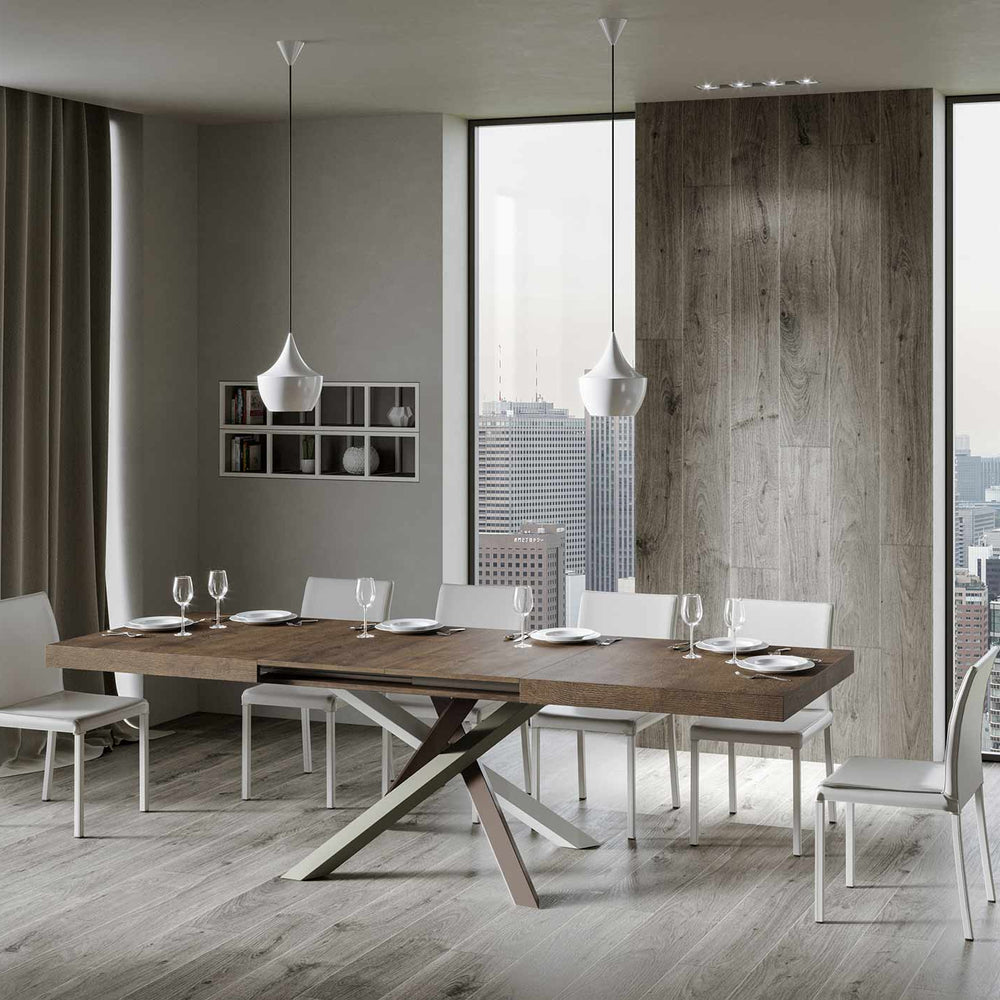 Tavolo allungabile Affi da 120 cm, dal design moderno dallo stile sofisticato, si adatta a qualsiasi stile di arredamento e si rivela la scelta ideale sia come tavolo da pranzo che come elemento d'arredo per il soggiorno, dove poter accogliere i propri ospiti con stile.Il tavolo allungabile Affi è in grado di estendersi progressivamente fino a 224 cm capace di ospitare 10 persone.Realizzato con pannelli in nobilitato, gambe in ferro, piano con lavorazione a Folding.Il sistema di estensione con guide telescopiche in alluminio rende il tavolo stabile e robusto anche se totalmente allungato, senza bisogno di ulteriori sostegni.Le allunghe sono immediatamente pronte all'utilizzo in quanto alloggiate sotto il piano principale.Made in ItalyDimensioni:Tavolo chiuso: L.120 P.90 H.77 cmLunghezza con 1 allunga: 172 cmLunghezza con 2 allunghe: 224 cm