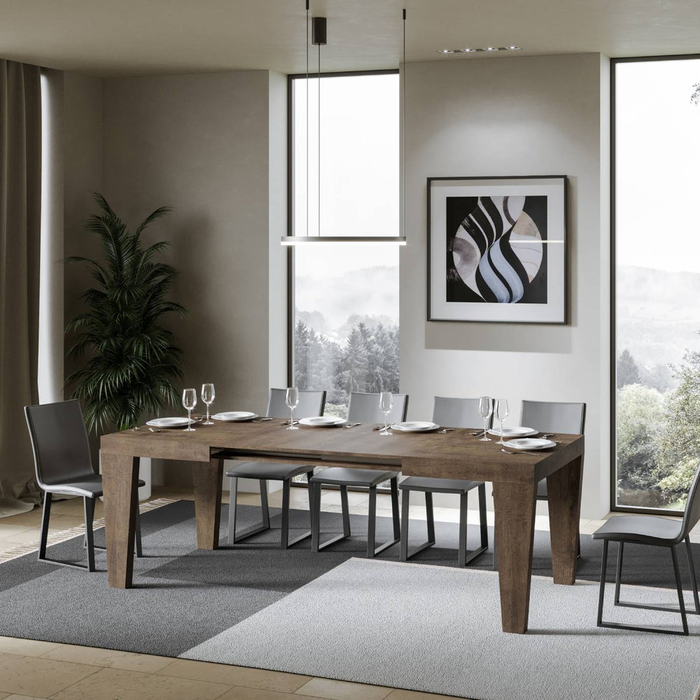 Tavolo allungabile Scorzè da 140 cm, dal design geometrico essenziale, si adatta a qualsiasi stile di arredamento e si rivela la scelta ideale sia come tavolo da pranzo che come elemento d'arredo per il soggiorno, dove poter accogliere i propri ospiti con stile.Il tavolo allungabile Scorzè è in grado di estendersi progressivamente fino a 244 cm capace di ospitare 12 persone.Realizzato interamente con pannelli in nobilitato, piano con lavorazione a Folding.Il sistema di estensione con guide telescopiche in alluminio rende il tavolo stabile e robusto anche se totalmente allungato, senza bisogno di ulteriori sostegni.Le allunghe sono immediatamente pronte all'utilizzo in quanto alloggiate sotto il piano principale.Made in ItalyDimensioni:Tavolo chiuso: L.140 P.90 H.77 cmLunghezza con 1 allunga: 192 cmLunghezza con 2 allunghe: 244 cm