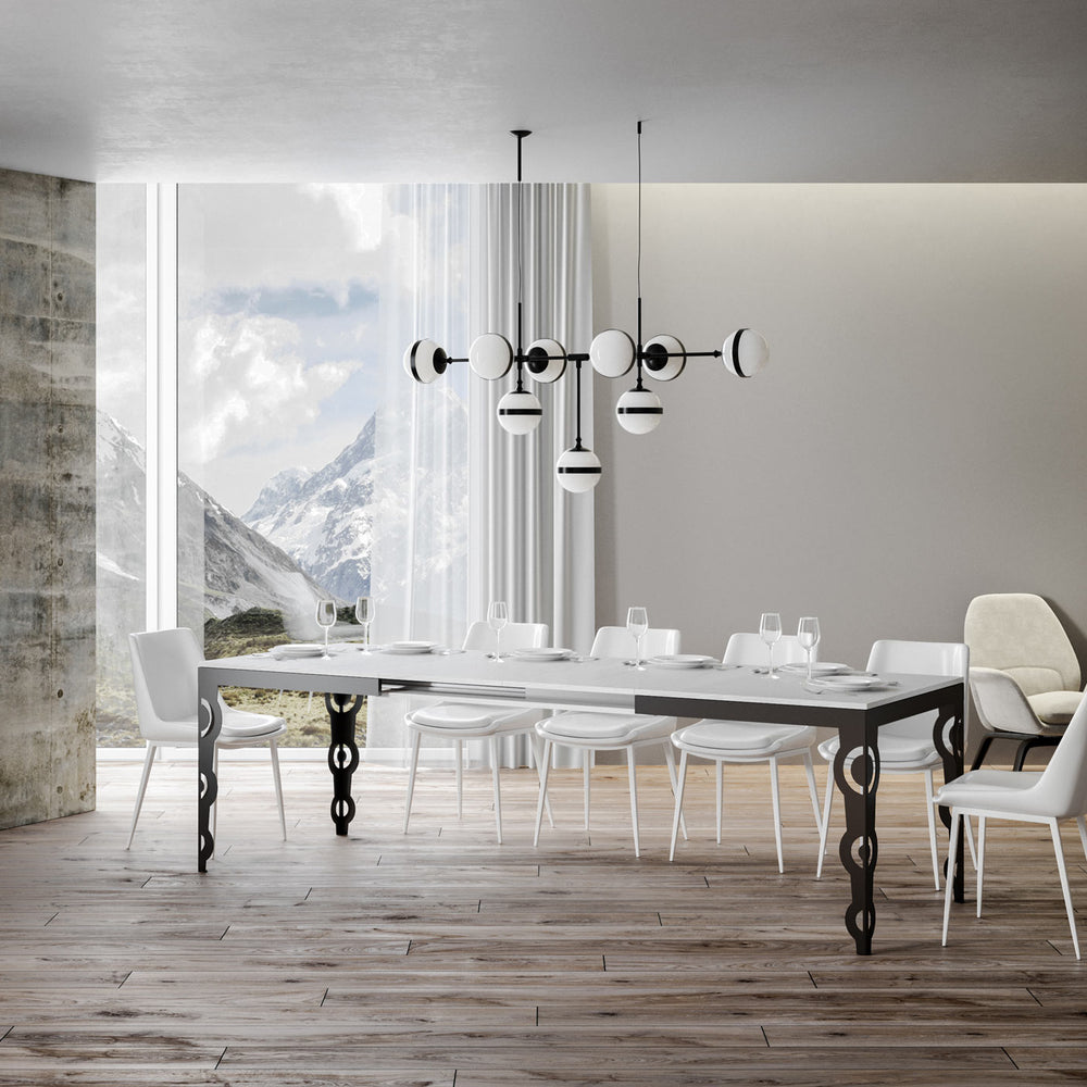Tavolo allungabile Noale Evolution da 160 cm, dal design moderno dallo stile ricercato e stravagante, si adatta a qualsiasi stile di arredamento e si rivela la scelta ideale sia come tavolo da pranzo che come elemento d'arredo per il soggiorno, dove poter accogliere i propri ospiti con stile.Il tavolo allungabile Noale Evolution è in grado di estendersi progressivamente fino a 264 cm capace di ospitare 12 persone.Realizzato con pannelli in nobilitato, telaio e gambe in ferro.Il sistema di estensione con guide telescopiche in alluminio rende il tavolo stabile e robusto anche se totalmente allungato, senza bisogno di ulteriori sostegni.Le allunghe sono immediatamente pronte all'utilizzo in quanto alloggiate sotto il piano principale.Made in ItalyDimensioni:Tavolo chiuso: L.160 P.90 H.77 cmLunghezza con 1 allunga: 212 cmLunghezza con 2 allunghe: 264 cm