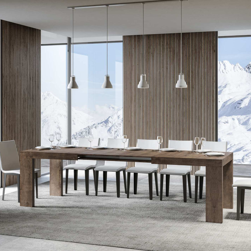 Tavolo allungabile Pianiga da 160 cm, dal design geometrico essenziale, si adatta a qualsiasi stile di arredamento e si rivela la scelta ideale sia come tavolo da pranzo che come elemento d'arredo per il soggiorno, dove poter accogliere i propri ospiti con stile.Il tavolo allungabile Pianiga è in grado di estendersi progressivamente fino a 264 cm capace di ospitare 12 persone.Realizzato interamente con pannelli in nobilitato, piano con lavorazione a Folding.Il sistema di estensione con guide telescopiche in alluminio rende il tavolo stabile e robusto anche se totalmente allungato, senza bisogno di ulteriori sostegni.Le allunghe sono immediatamente pronte all'utilizzo in quanto alloggiate sotto il piano principale.Made in ItalyDimensioni:Tavolo chiuso: L.160 P.90 H.77 cmLunghezza con 1 allunga: 212 cmLunghezza con 2 allunghe: 264 cm