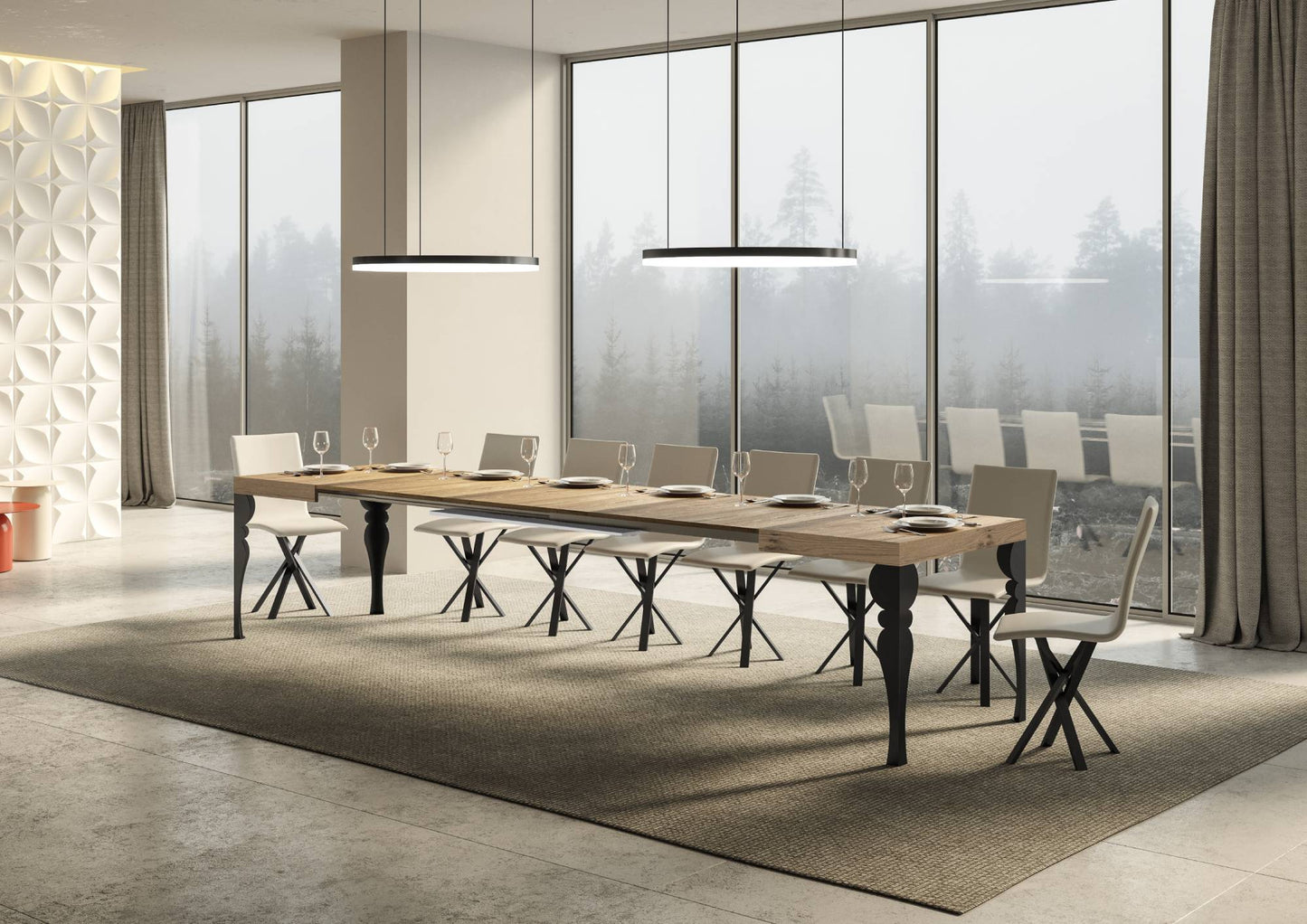 Tavolo allungabile Mira da 180 cm, dal design moderno dallo stile ricercato e stravagante, si adatta a qualsiasi stile di arredamento e si rivela la scelta ideale sia come tavolo da pranzo che come elemento d'arredo per il soggiorno, dove poter accogliere i propri ospiti con stile.Il tavolo allungabile Mira è in grado di estendersi progressivamente fino a 440 cm capace di ospitare 18 persone.Realizzato con pannelli in nobilitato, gambe in ferro, piano con lavorazione a Folding.Il sistema di estensione con guide telescopiche in alluminio e il sostegno centrale in dotazione rendono il tavolo stabile e robusto anche se totalmente allungato.Due allunghe sono alloggiate sotto il piano pronte all'utilizzo mentre le rimanenti tre vanno riposte altrove.Made in ItalyDimensioni:Tavolo chiuso: L.180 P.90 H.77 cmLunghezza con 1 allunga: 232 cmLunghezza con 2 allunghe: 284 cmLunghezza con 3 allunghe: 336 cmLunghezza con 4 allunghe: 388 cmLunghezza con 5 allunghe: 440 cm
