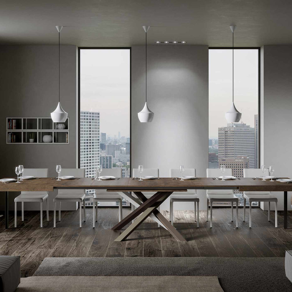 Tavolo allungabile Affi da 180 cm, dal design moderno dallo stile sofisticato, si adatta a qualsiasi stile di arredamento e si rivela la scelta ideale sia come tavolo da pranzo che come elemento d'arredo per il soggiorno, dove poter accogliere i propri ospiti con stile.Il tavolo allungabile Affi è in grado di estendersi progressivamente fino a 440 cm capace di ospitare 18 persone.Realizzato con pannelli in nobilitato, gambe in ferro, piano con lavorazione a Folding.Il sistema di estensione con guide telescopiche in alluminio e i sostegni laterali in dotazione rendono il tavolo stabile e robusto anche se totalmente allungato.Due allunghe sono alloggiate sotto il piano pronte all'utilizzo mentre le rimanenti tre vanno riposte altrove.Made in ItalyDimensioni:Tavolo chiuso: L.180 P.90 H.77 cmLunghezza con 1 allunga: 232 cmLunghezza con 2 allunghe: 284 cmLunghezza con 3 allunghe: 336 cmLunghezza con 4 allunghe: 388 cmLunghezza con 5 allunghe: 440 cm