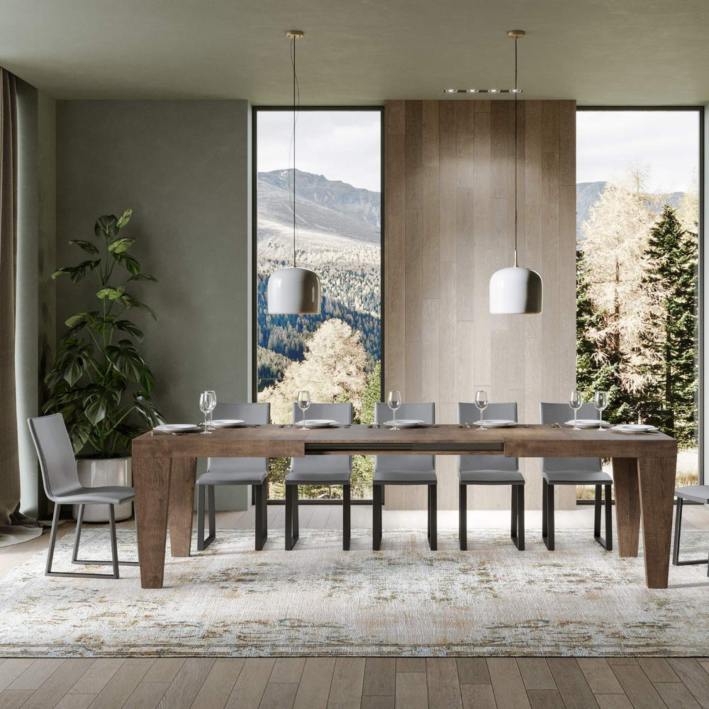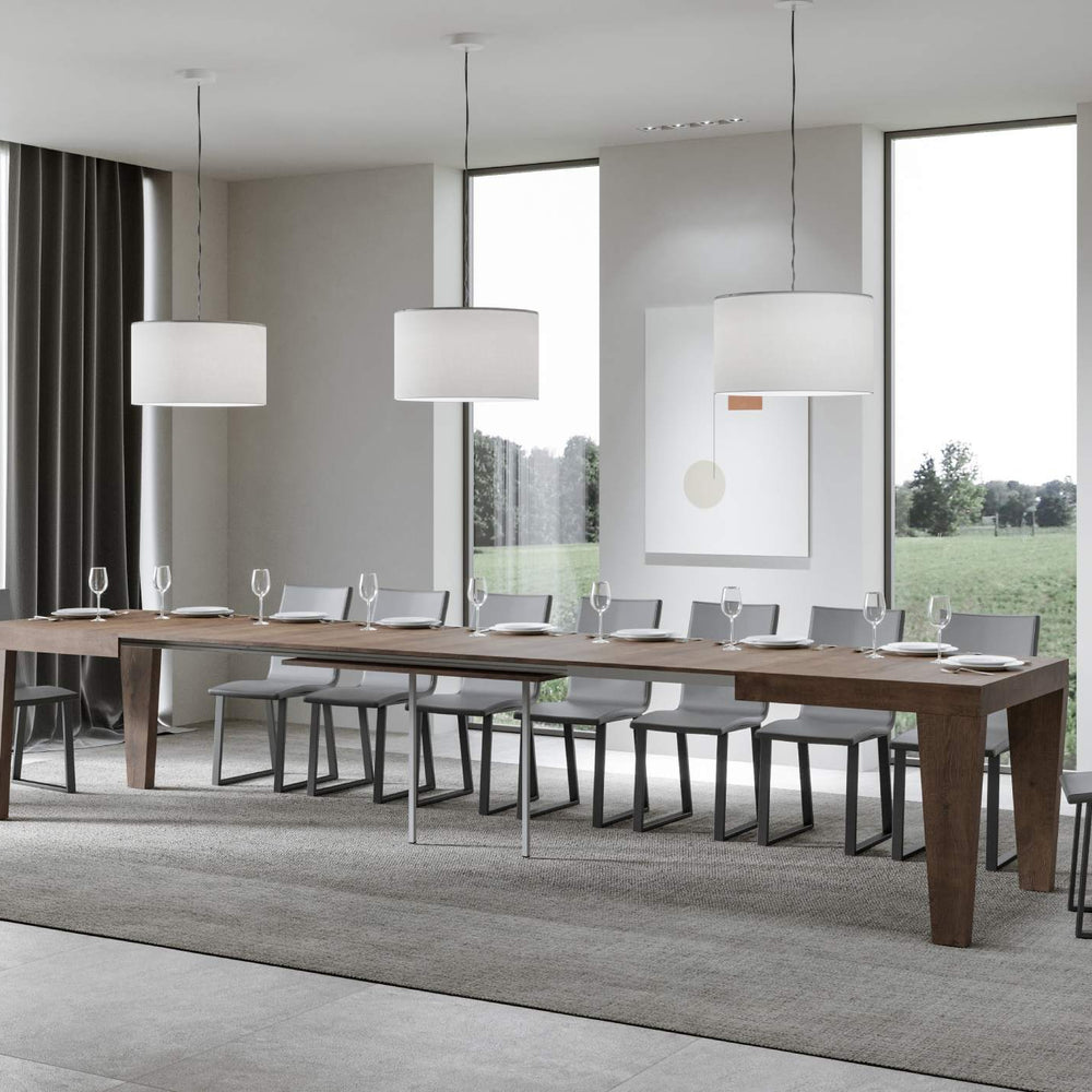 Tavolo allungabile Scorzè da 180 cm, dal design geometrico essenziale, si adatta a qualsiasi stile di arredamento e si rivela la scelta ideale sia come tavolo da pranzo che come elemento d'arredo per il soggiorno, dove poter accogliere i propri ospiti con stile.Il tavolo allungabile Scorzè è in grado di estendersi progressivamente fino a 440 cm capace di ospitare 18 persone.Realizzato interamente con pannelli in nobilitato, piano con lavorazione a Folding.Il sistema di estensione con guide telescopiche in alluminio e il sostegno centrale in dotazione rendono il tavolo stabile e robusto anche se totalmente allungato.Due allunghe sono alloggiate sotto il piano pronte all'utilizzo mentre le rimanenti tre vanno riposte altrove.Made in ItalyDimensioni:Tavolo chiuso: L.180 P.90 H.77 cmLunghezza con 1 allunga: 232 cmLunghezza con 2 allunghe: 284 cmLunghezza con 3 allunghe: 336 cmLunghezza con 4 allunghe: 388 cmLunghezza con 5 allunghe: 440 cm
